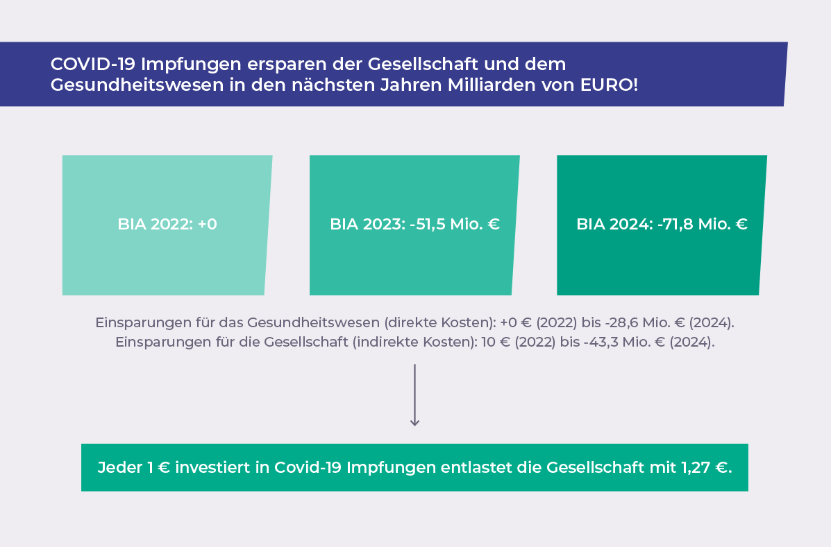 Eine höhere Anzahl an COVID-19-Auffrischungsimpfungen führt zu erheblich reduzierten Kosten für die Gesellschaft. Konkret sind es mehr als 123 Millionen Euro bis Ende 2024. Das bedeutet: Jeder in eine COVID-19-Impfung investierte Euro entlastet die Gesellschaft um 1,27 Euro.